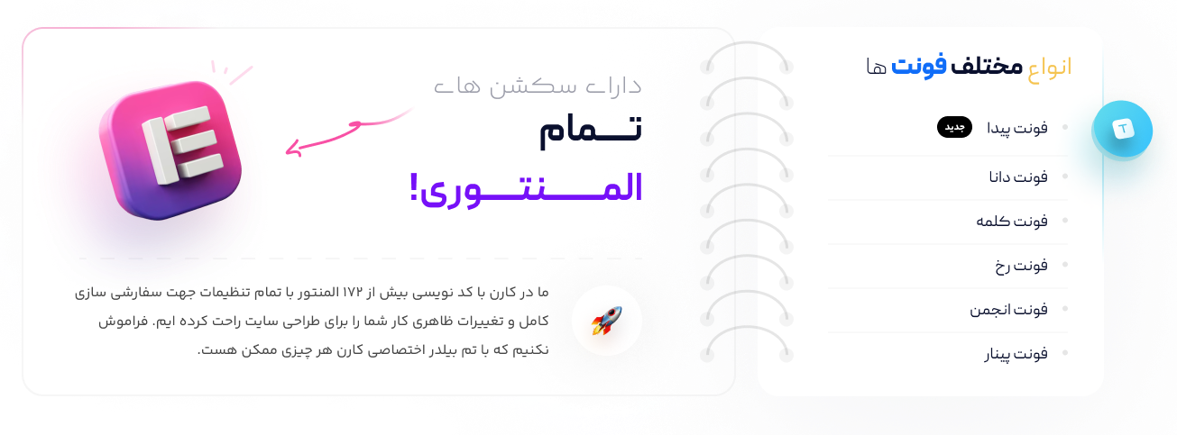 در بیش از 31 دمو مختلف که هر کدام یک وبسایت کامل با تمام صفحات مورد نیاز هست بیشاز 63 سکشن کامل با المان های کارن طراحی شده است.
